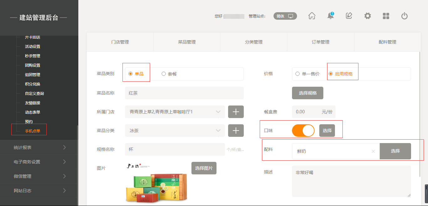 2.点击“菜品管理”添加菜品,添加菜品时有两种选项,一个是“单品”,另一个是“套餐”,当点击“套餐”时,我们选择之前添加好的单品进行组合即可;当添加菜品时,我们也可以给该菜品添加“口味”以及“配料”,同时我们也可以给该菜品进行“规格”设置,如“大杯”“小杯”等,在前端添加菜品时都会体现出来,填写完成后点击保存即可,如图所示: